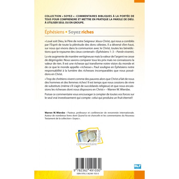 «Trop de chrétiens vivent comme des pauvres alors que Christ a fait de nous des hommes et des femmes riches! Il est temps que nous cessions de vivre de substituts (même s’il s’agit de succédanés religieux) et que nous encaissions les richesses dont nous disposons en Christ» Warren W. Wiersbe.