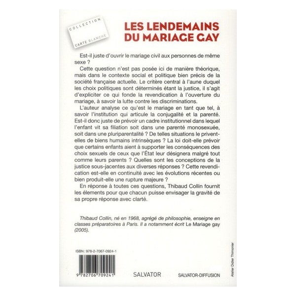 Est-il juste d'ouvrir le mariage civil aux personnes de même sexe ? Cette question n'est pas posée dans l'abstraction d'une réflexion théorique, mais dans un contexte social et politique bien précis dont il faut partir, la société française en 2012. C'est donc une question pratique qui exige une délibération de chaque citoyen devant se déterminer politiquement. Le critère central à l'aune duquel les choix politiques sont déterminés étant la justice, il s'agit d'expliciter ce qui fonde la revendication à l'ouverture du mariage, à savoir la lutte contre les discriminations. Selon les présupposés d'une telle revendication, ne serait-il pas plus cohérent de réclamer l'abolition du mariage civil et son remplacement par un " contrat de vie commune " à x partenaires ? Après cette première partie, l'auteur analyse ce qu'est le mariage en tant que tel : l'institution articulant la conjugalité et la parenté. Ceci met en pleine lumière le fait que l'ouverture du mariage civil a pour enjeu central le traitement que l'Etat réserve aux enfants qui naissent dans ces familles. La question devient : est-il juste de prévoir un cadre institutionnel dans lequel l'enfant vit sa filiation soit dans une parenté monosexuée, soit dans une pluriparentalité ? De telles situations ne le privent-elles pas de biens humains intrinsèques ? Dans un dernier temps, il s'agit de manifester que la neutralité éthique de l'Etat parfois invoquée pour soutenir l'ouverture du mariage ne fonctionne pas dans ce cas, puisqu'il s'agit ici non pas de promouvoir des droits individuels de manière unilatérale, mais bien d'exercer un arbitrage juste entre des adultes ayant certaines pratiques sexuelles et des enfants. Est-il juste que la loi prévoit que certains enfants aient à supporter les conséquences des choix sexuels de ceux que l'Etat leur désignera malgré tout comme leurs parents ?