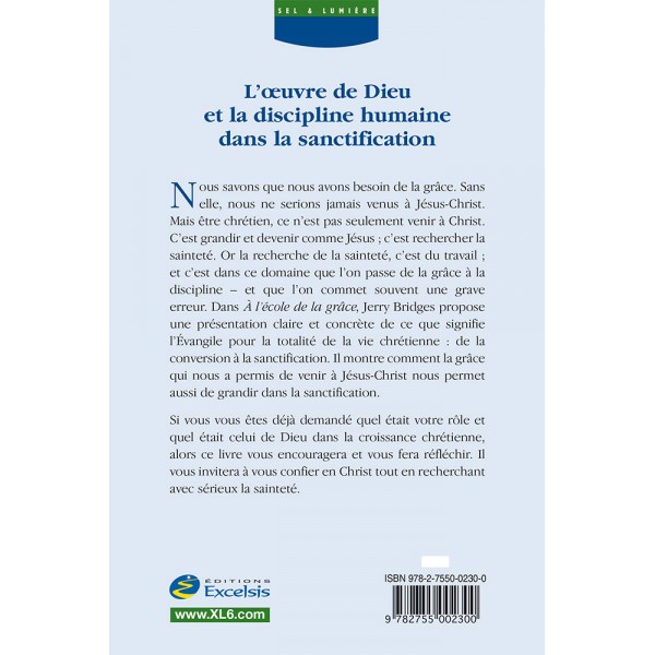Nous savons que nous avons besoin de la grâce. Sans elle, nous ne serions jamais venus à Jésus-Christ. Mais être chrétien, ce n’est pas seulement venir à Christ. C’est grandir et devenir comme Jésus ; c’est rechercher la sainteté. Or la recherche de la sainteté, c’est du travail ; et c’est dans ce domaine que l’on passe de la grâce à la discipline – et que l’on commet souvent une grave erreur. Dans À l’école de la grâce, Jerry Bridges propose une présentation claire et concrète de ce que signifie l’Évangile pour la totalité de la vie chrétienne : de la conversion à la sanctification. Il montre comment la grâce qui nous a permis de venir à Jésus-Christ nous permet aussi de grandir dans la sanctification.