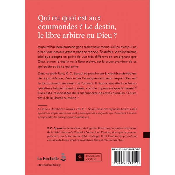 Dans ce petit livre, R. C. Sproul se penche sur la doctrine chrétienne de la providence, c’est-à -dire l’enseignement selon lequel Dieu est le tout-puissant souverain de l’univers. Il répond ensuite à certaines questions fréquemment posées, comme : qu’est-ce que le hasard ? Dieu est-il responsable de la méchanceté des êtres humains ? Qu’en est-il de la liberté humaine ?