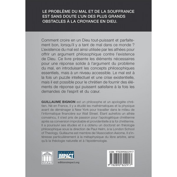 Comment croire en un Dieu tout-puissant et parfaitement bon, lorsqu’il y a tant de mal dans ce monde ? L’existence du mal est ainsi utilisée par les athées pour offrir un argument philosophique contre l’existence de Dieu. Ce livre présente les éléments nécessaires pour une réponse solide à l’argument du problème du mal, en introduisant les concepts philosophiques essentiels, mais à un niveau accessible. Le mal est à la fois un puzzle intellectuel et une crise existentielle, mais il est possible pour le chrétien de fournir des éléments de réponse qui puissent satisfaire à la fois les demandes de l’esprit et du coeur.