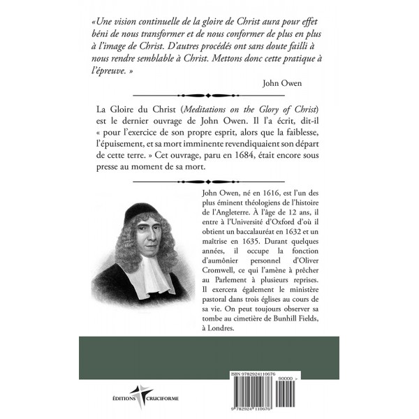 John Owen, né en 1616, est l’un des plus éminents théologiens de l’histoire de l’Angleterre. À l’âge de 12 ans, il entre à l’Université d’Oxford d’où il obtient un baccalauréat en 1632 et une maîtrise en 1635. Durant quelques années, il occupe la fonction d’aumônier personnel d’Oliver Cromwell, ce qui l’amène à prêcher au Parlement à plusieurs reprises. Il exercera également le ministère pastoral dans trois églises au cours de sa vie. On peut encore voir sa tombe au cimetière de Bunhill Fields, à Londres.