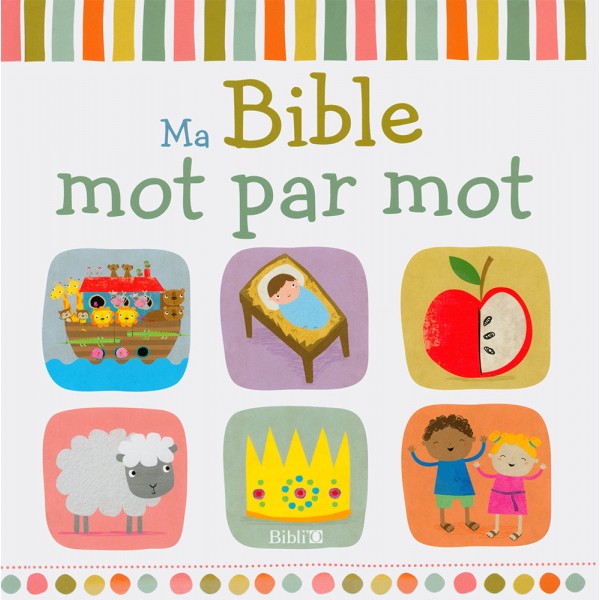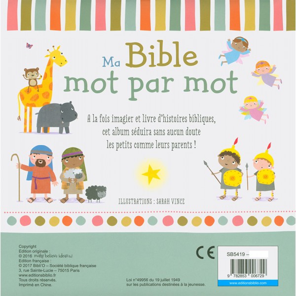 Ma Bible mot par mot Éditeur : Bibli'o Catégorie : Enfants - 6 ans Pages (ou cartes) : 16 Poids : 425 g Dépôt légal : 2016 Dimensions : 20,8 x 21 x 2 cm EAN : 9782853006729