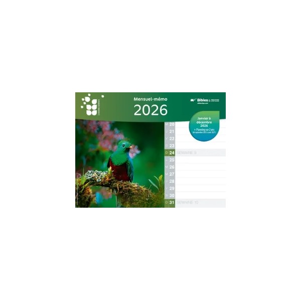 Calendrier Mensuel-mémo, 2026Éditeur : BPC, Bibles et publications chrétiennes Catégorie :  calendriers Pages (ou cartes) : 26 Poids : 114 g Dépôt légal : octobre 2026Dimensions :  Format fermé 27x21 cm Format ouvert 27x42 cm EAN : 9782879078526