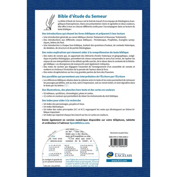 Bible d’étude, version Semeur, souple bleue [Relié]Couverture souple bleue, tranche blancheÉditeur : ExcelsisCollection : Bible Semeur d’étudeCatégorie 1 : Bibles » SemeurPages (ou cartes) : 2320Poids : 1535 grammesDépôt légal : Juin 2022Dimensions : 17,8 x 24,8 x 4,6 centimètresEAN / Référence : 9782755004854