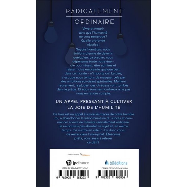 Ce livre est un appel à suivre les traces de notre humble roi, à abandonner la vision humaine du succès et commencer à vivre de manière radicalement ordinaire. Je ne pouvais pas aborder ce sujet et, en même temps, me mettre en valeur. J’ai donc choisi de rester dans l’anonymat. Êtes-vous prêts, vous aussi à relever ce défi ?